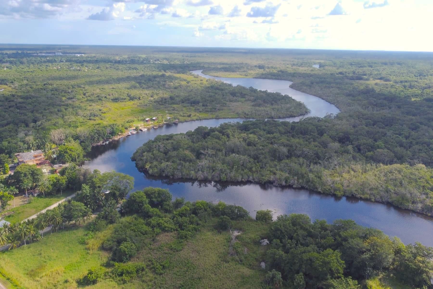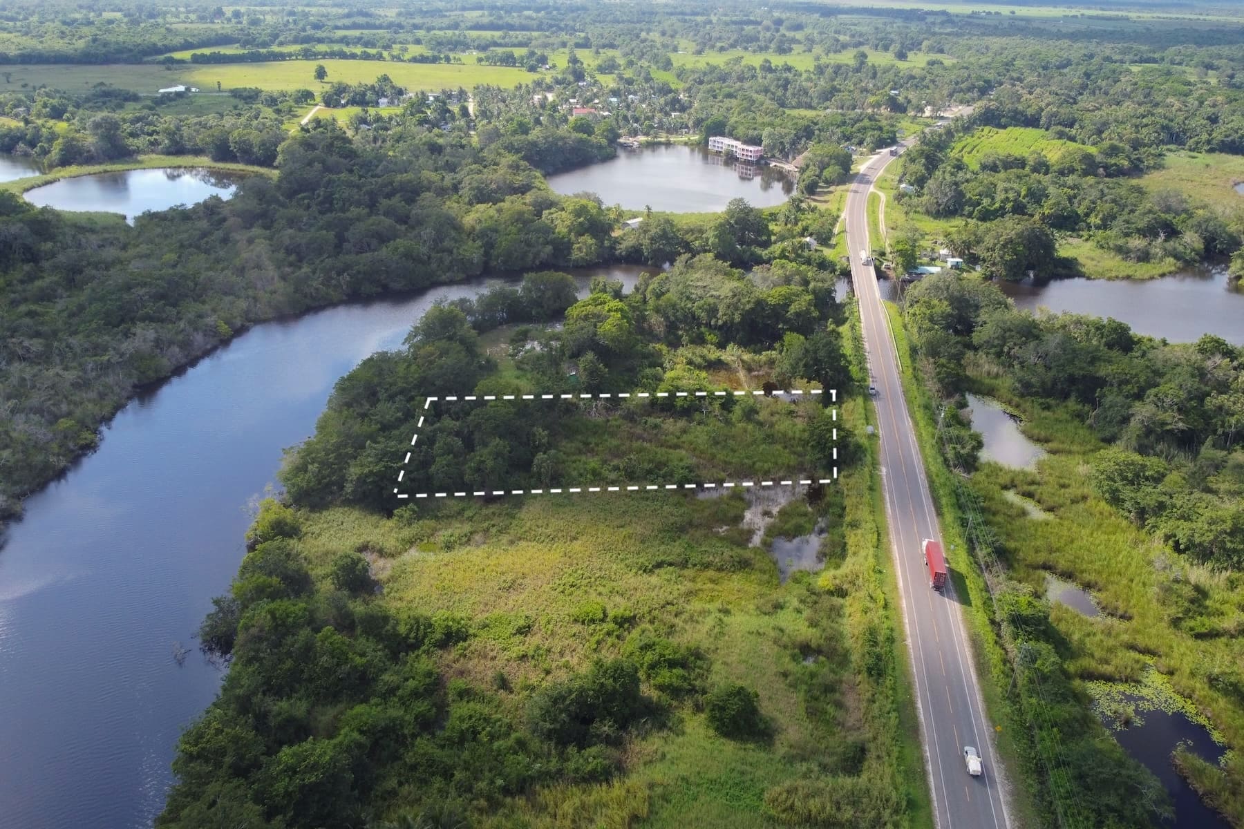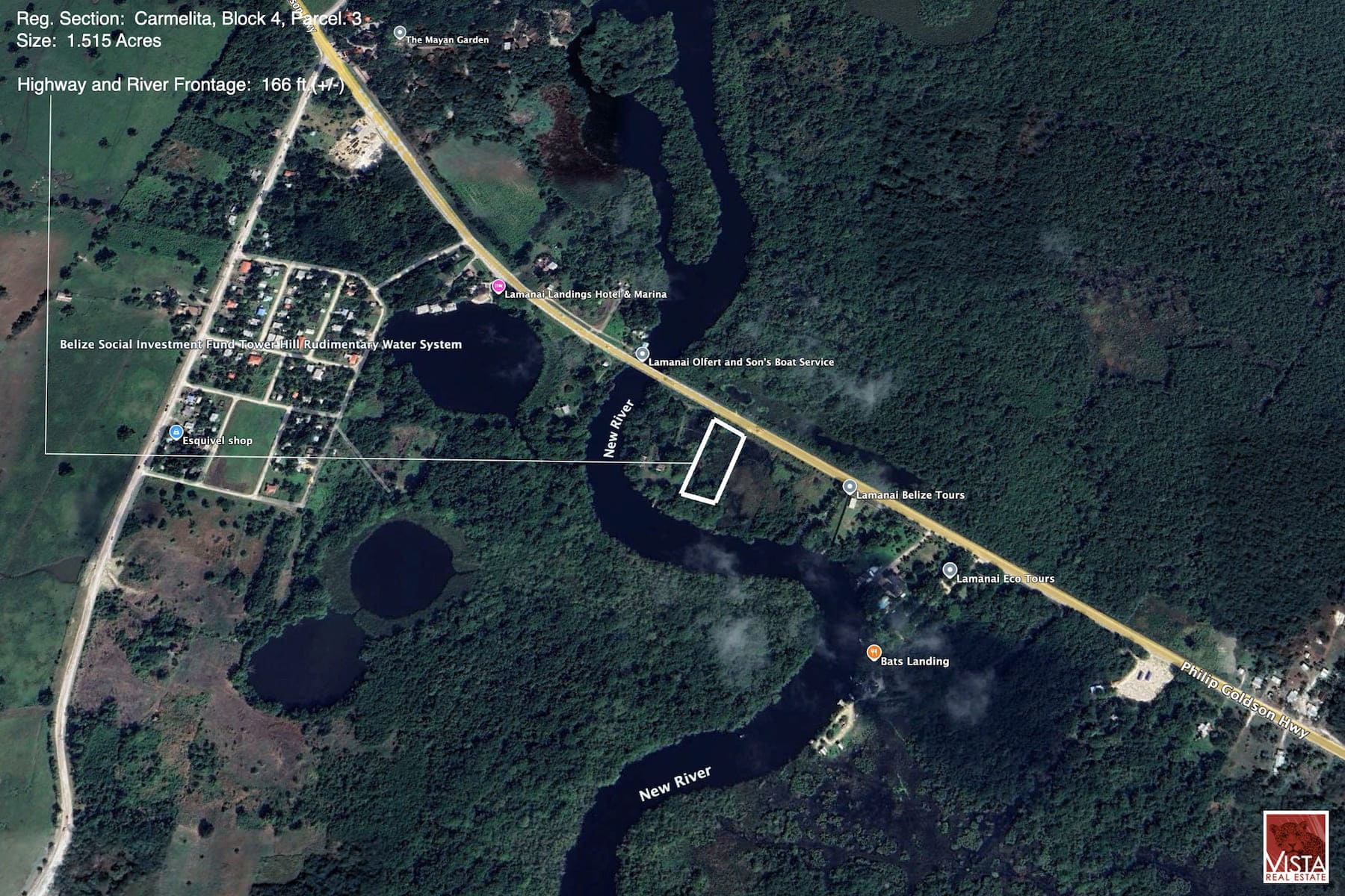 Beautiful 1.5-Acre property offers 166 ft.(+/-) along the Phillip Goldson Highway and the rolling New River in Carmelita Village, Orange Walk District, Belize. Land is perfectly positioned east of Tower Hill Bridge and west of the Lamanai Landings Hotel and Marina, blending privacy, tranquility and convenience effortlessly.