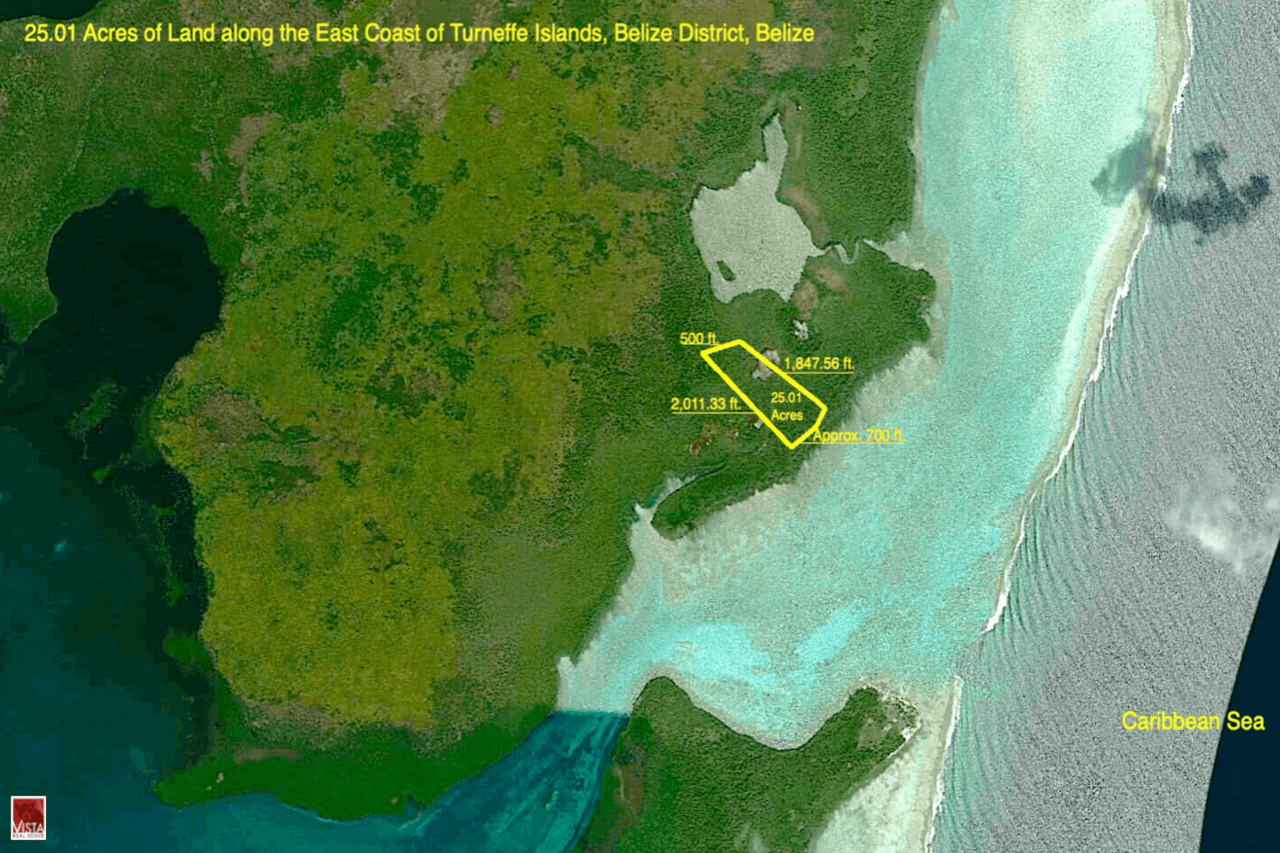 The Turneffe Atoll is located 20 miles from Belize City and is considered to be the largest coral atoll in Belize and in the Mesoamerican Barrier Reef System. The property is 25.01 acres of pristine undeveloped land and is located along the east coast of the Turneffe Islands and approximately 0.82 miles from Turneffe Flats Island Resort. The property measures approximately 1847.56 ft x approx. 700 ft x 2011.33 ft x 500 ft.