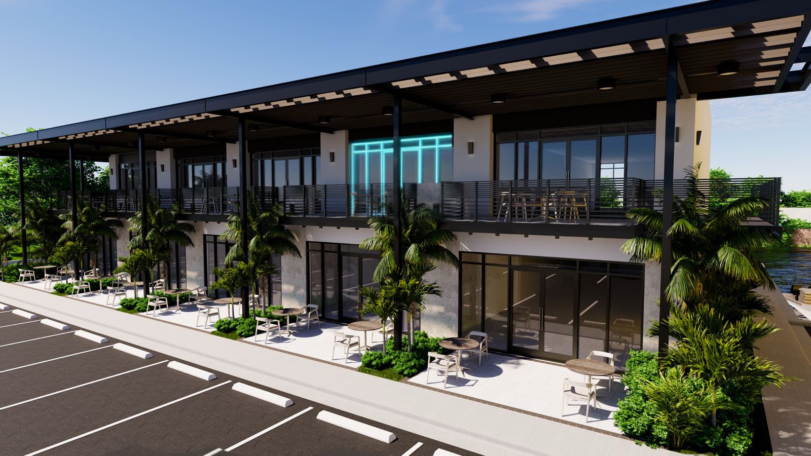 The space features sleek finishes and a functional layout ideal for professional tenants such as law firms, financial services, consultancies, or medical/administrative offices. For those seeking spaces for Retail and other services, the upper level offers an outdoor terrace leading out towards the parking lot. This office space boasts a serene river view and natural lighting at both ends. The unit includes a private restroom with the interior finished with painted concrete and a modern commercial blank slate for you to customize.
