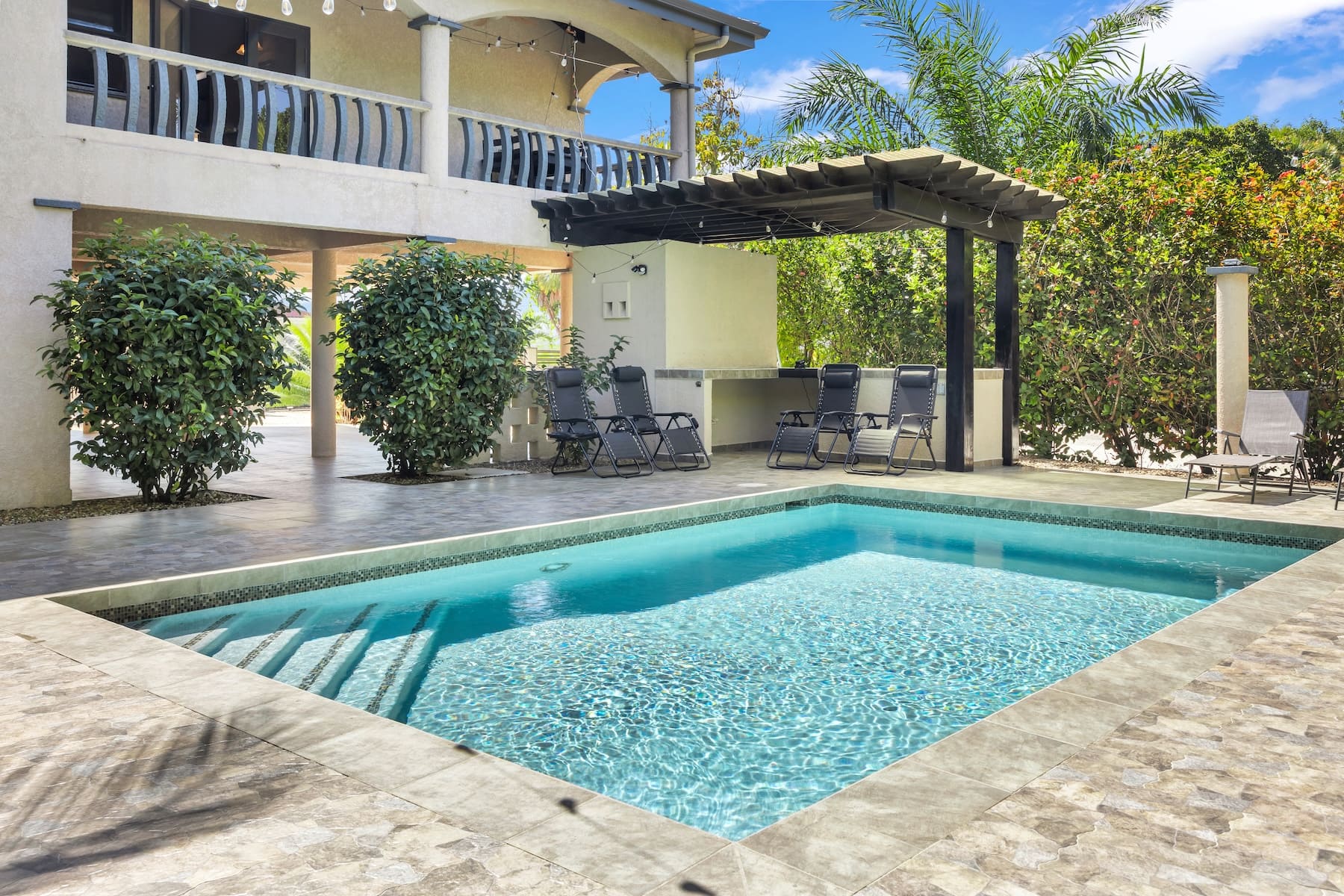 At the heart of the property is a beautifully finished pool framed by a spacious tiled deck—perfect for morning swims, sunset gatherings, or simply soaking in the sunshine. The home itself features generous verandas designed to capture the coastal breeze and offer seamless indoor-outdoor living.