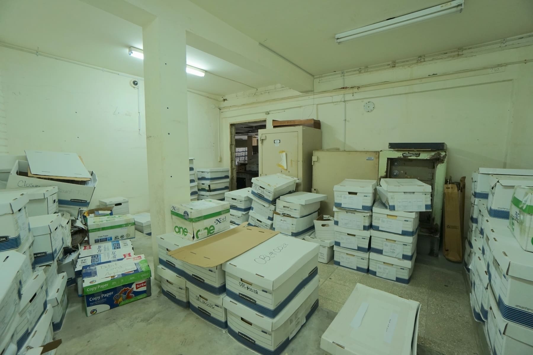 The Ground Floor (2,290 sq. ft.) features tiled floors and fully reinforced concrete walls. It comprises an Open Lobby area, a Vault Room, a corridor leading to the ATM room, and an exterior staircase to the First Floor. The First floor is carpeted and includes a Reception area, 5 small offices, 1 Server Room, 1 Restroom with 2 stalls, a Kitchenette area, and a Filing Room. Additional features include a Split A/C Unit, Parking, shutters, and a fence.