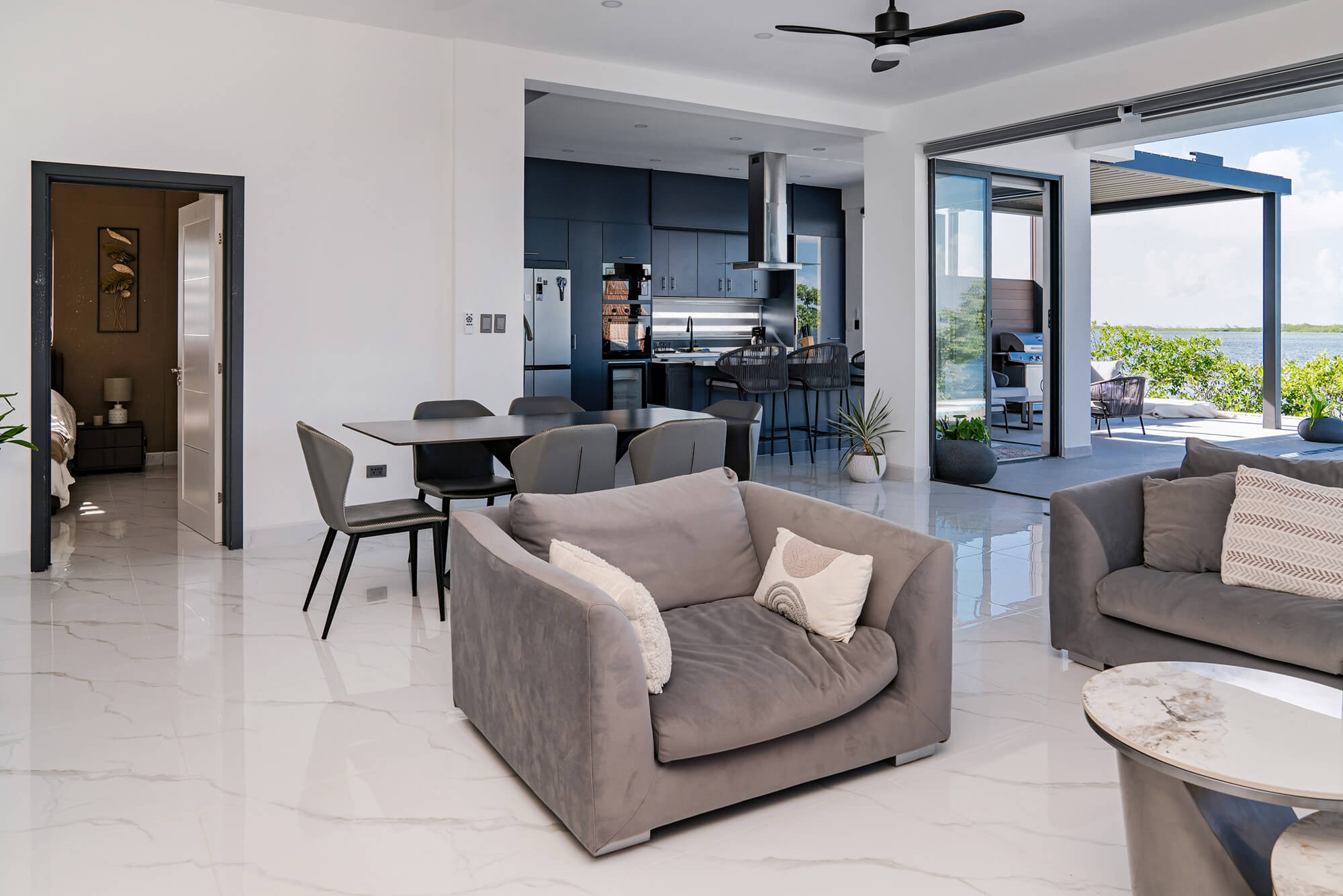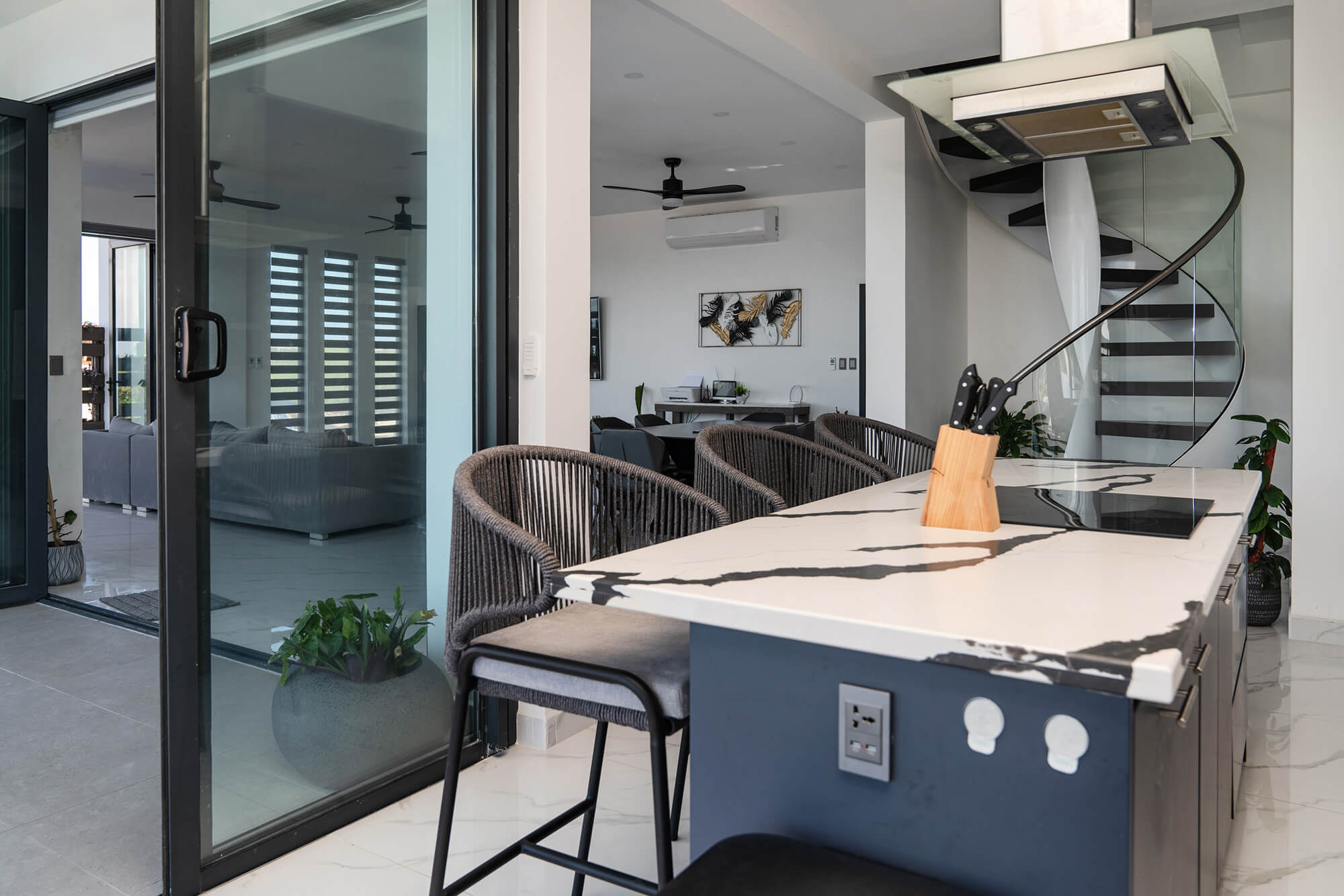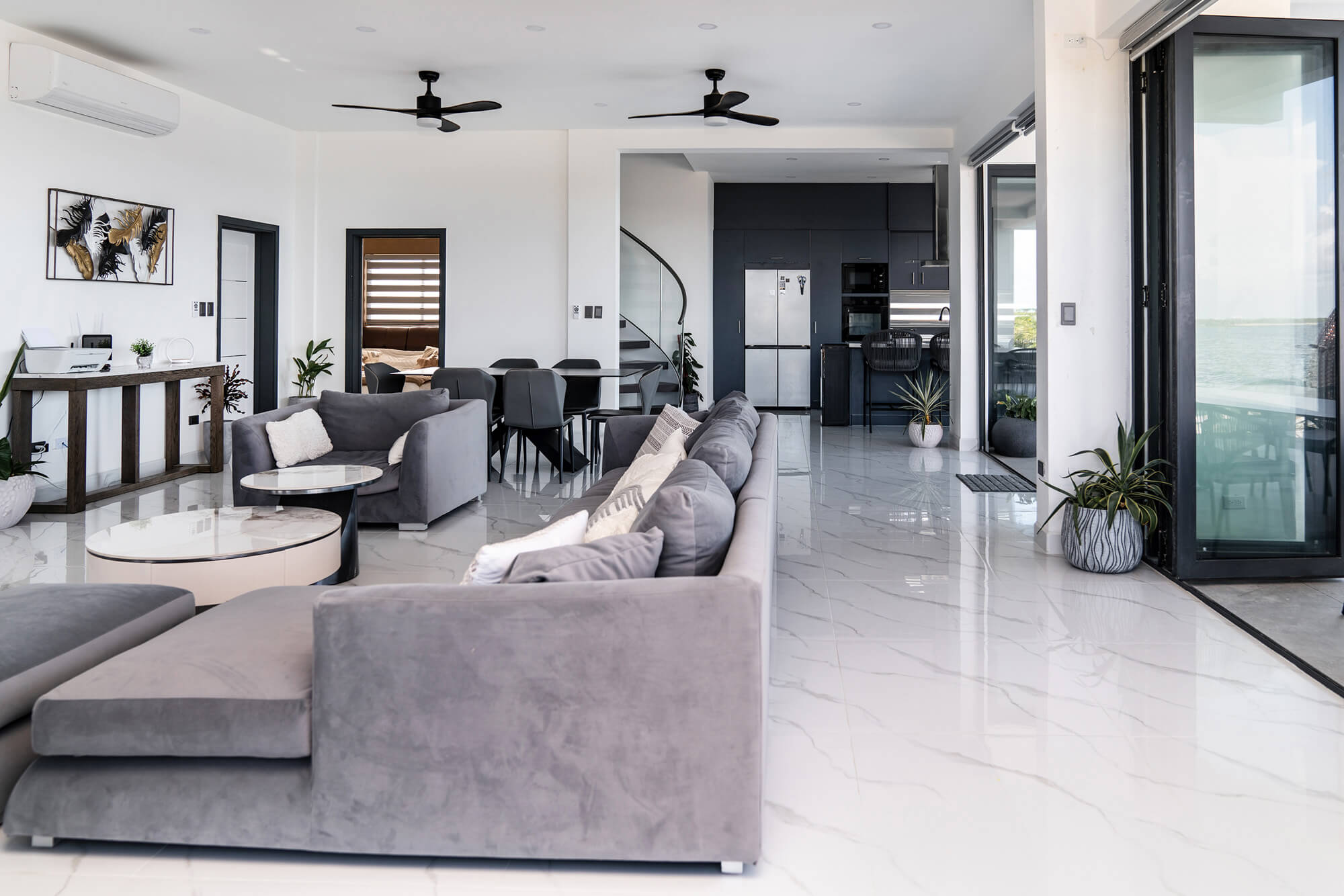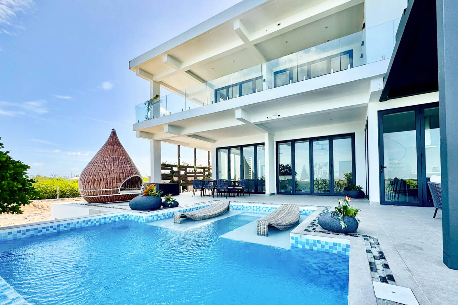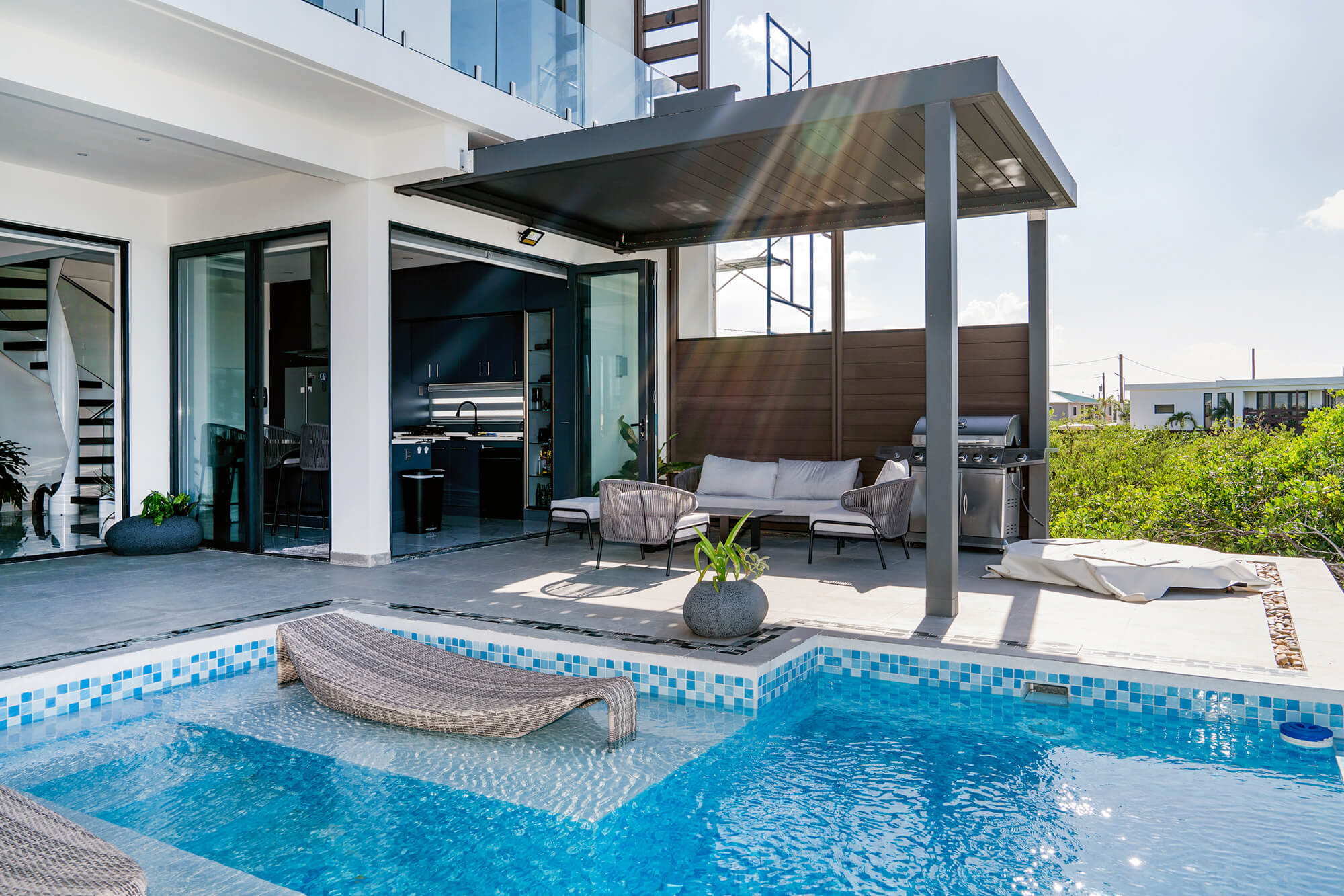 The Seascape Residence – A Modern Coastal Haven: Set across two beautifully designed levels, this villa offers over 4,000 square feet of elegant living space, featuring 4 bedrooms and 4.5 bathrooms. With every detail curated for comfort and sophistication, the home includes an expansive open terrace overlooking the water – ideal for alfresco dining and breathtaking sunset views; a private swimming pool, perfect for entertaining or unwinding in paradise; a chef-inspired kitchen, fully outfitted with premium appliances and high-end finishes; a spacious laundry room for added convenience and sits in a gated, landscaped property, ensuring privacy and security