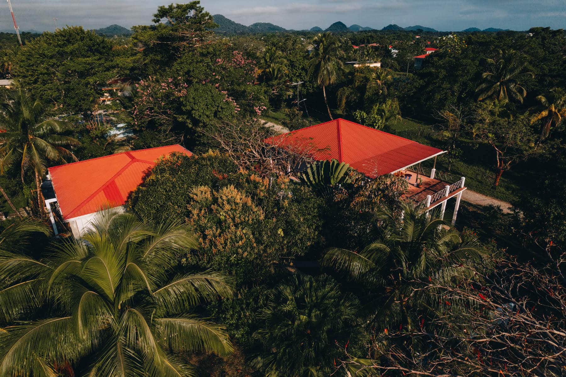 The second structure, the property’s northern-most building, is very similar to the first. It has an area of approximately 2,736 sq. ft. The ground floor offers a 2 bed and 1 bath apartment looking out onto a large stone patio that also overlooks the garden and sea. The lower flat of the building also features tiled floors and high ceilings in all rooms including the living, dining and kitchen area. The ground floor of this structure is concrete block construction and offers additional room on the southern side that is used as a laundry bodega room, and on the west to the back is an office room with its own entrance and a built-in mahogany desk. There is an additional studio apartment with a full kitchen and en-suite bathroom behind the front-facing 2 bedroom flat that is occupied by the B&B manager. The top floor is also built of durable timber construction and features two units, one very large, one smaller. The units are tiled and have a bedroom divider, open living room, study, and kitchenette. Both give out onto a large veranda providing stunning views of the sea.